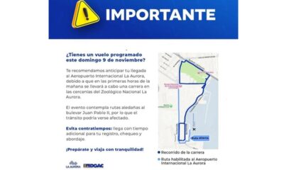 La Dirección General de Aeronáutica Civil recomienda a los pasajeros anticipar su llegada al Aeropuerto Internacional La Aurora, ante el congestionamiento vehicular previsto por una actividad...