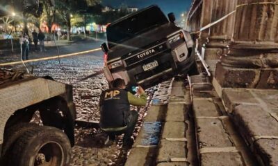 Un vehículo impactó contra las gradas del edificio municipal de Antigua Guatemala; el conductor fue detenido y dos peatones resultaron con heridas leves.