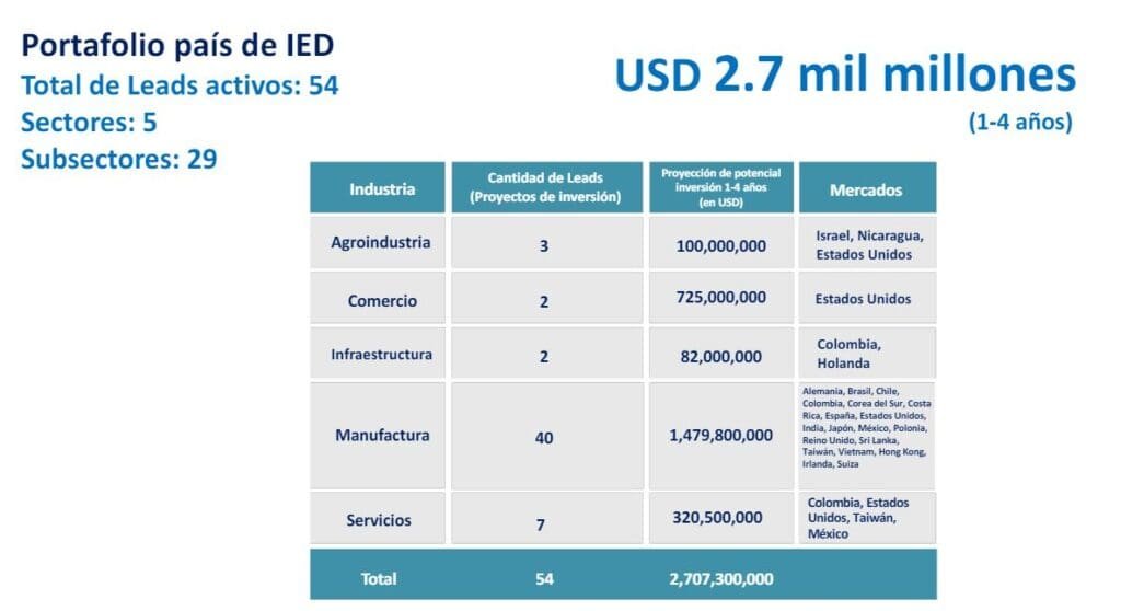 El portafolio de inversión extranjera directa indica que 54 empresas están evaluando invertir en Guatemala, abarcando cinco sectores y 29 subsectores. Entre los proyectos destacan iniciativas en agroindustria, comercio, infraestructura, manufactura y servicios, con inversiones potenciales que superan los 2,200 millones de dólares.