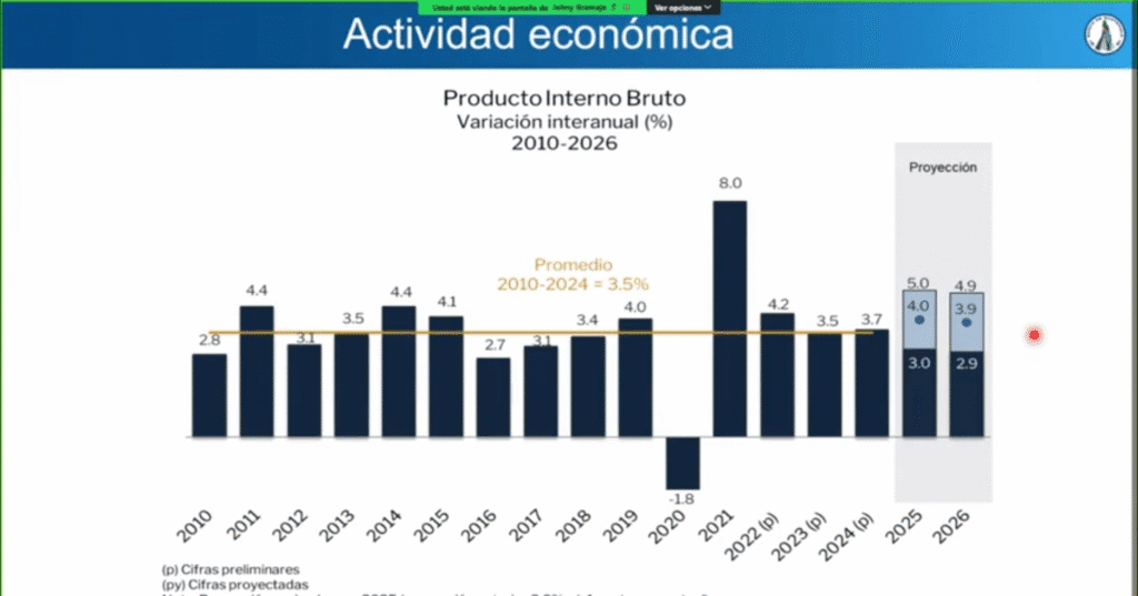 La nueva estimación de crecimiento del Producto Interno Bruto (PIB) en 2025 es de 4.0%, frente al 3.8% previamente previsto. Para 2026, la proyección se mantiene en 3.9%.