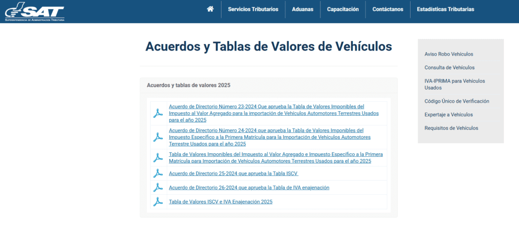 La SAT publicó en noviembre las Tablas de Valores Imponibles vigentes para el cálculo del impuesto, aprobadas mediante el Acuerdo de Directorio 25-2024. Estas tablas establecen las tarifas según características como marca, modelo y tipo de combustible.