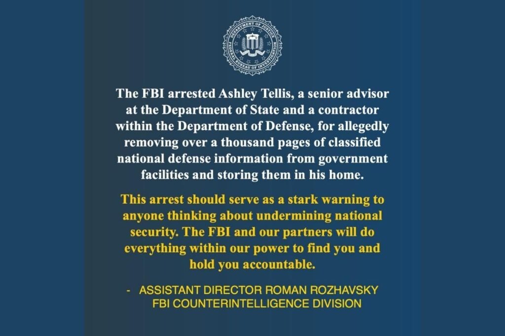 De acuerdo con el Departamento de Justicia de EE. UU., el FBI arrestó a Tellis el 11 de octubre luego de una investigación que reveló que el funcionario habría sustraído documentos de instalaciones seguras del gobierno. Presuntamente, los habría almacenado en su domicilio particular.