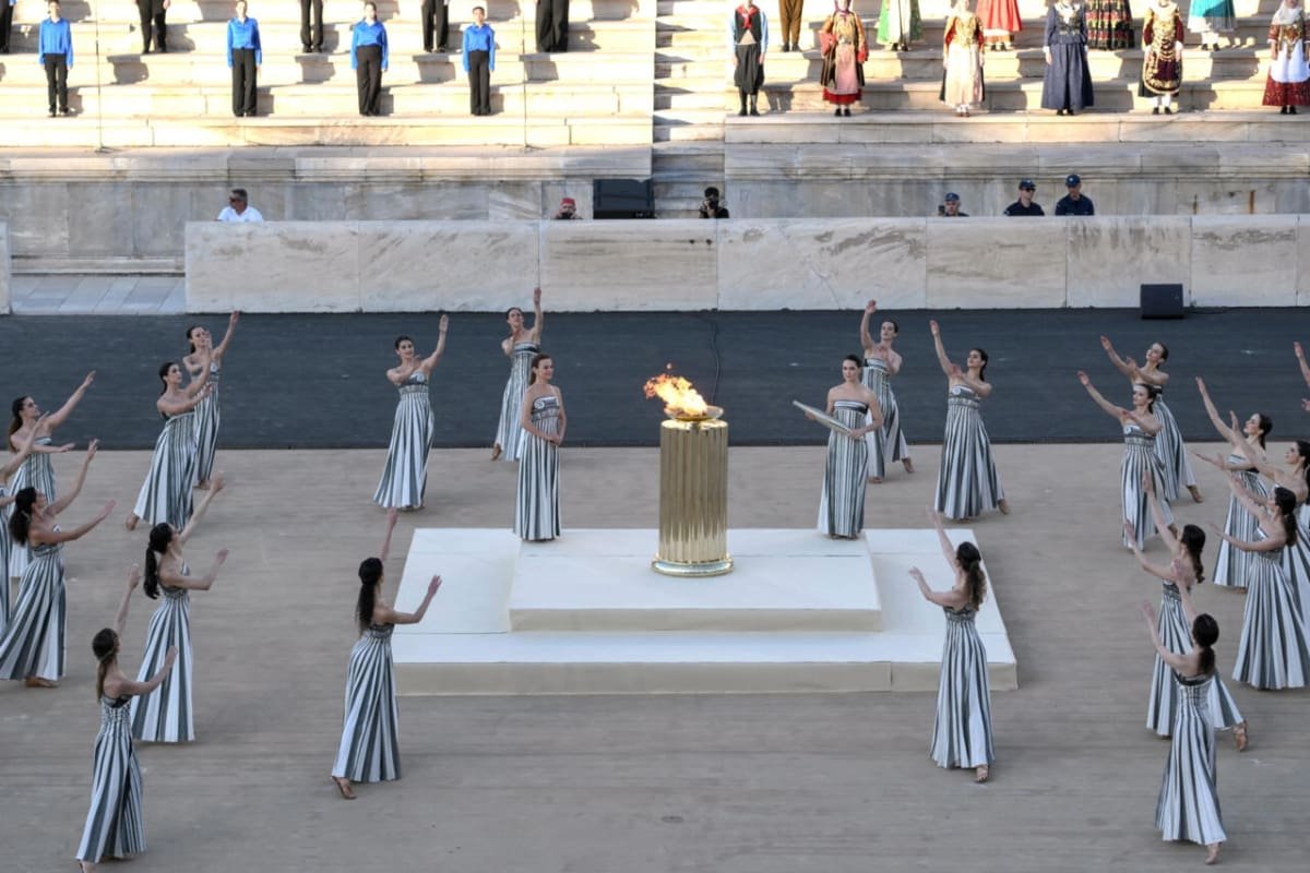 En el Panatenaico, el único estadio del mundo construido completamente en mármol, Antigoni Drisbioti, campeona europea de marcha, ingresó portando la llama olímpica y la entregó a la francesa Gabriela Papadakis, medalla de oro en patinaje en los Juegos Olímpicos de Invierno de Beijing 2022, quien se la dio a su compatriota Béatrice Hess, la deportista con más medallas paralímpicas en la historia de Francia (25 entre 1984 y 2004 en natación).