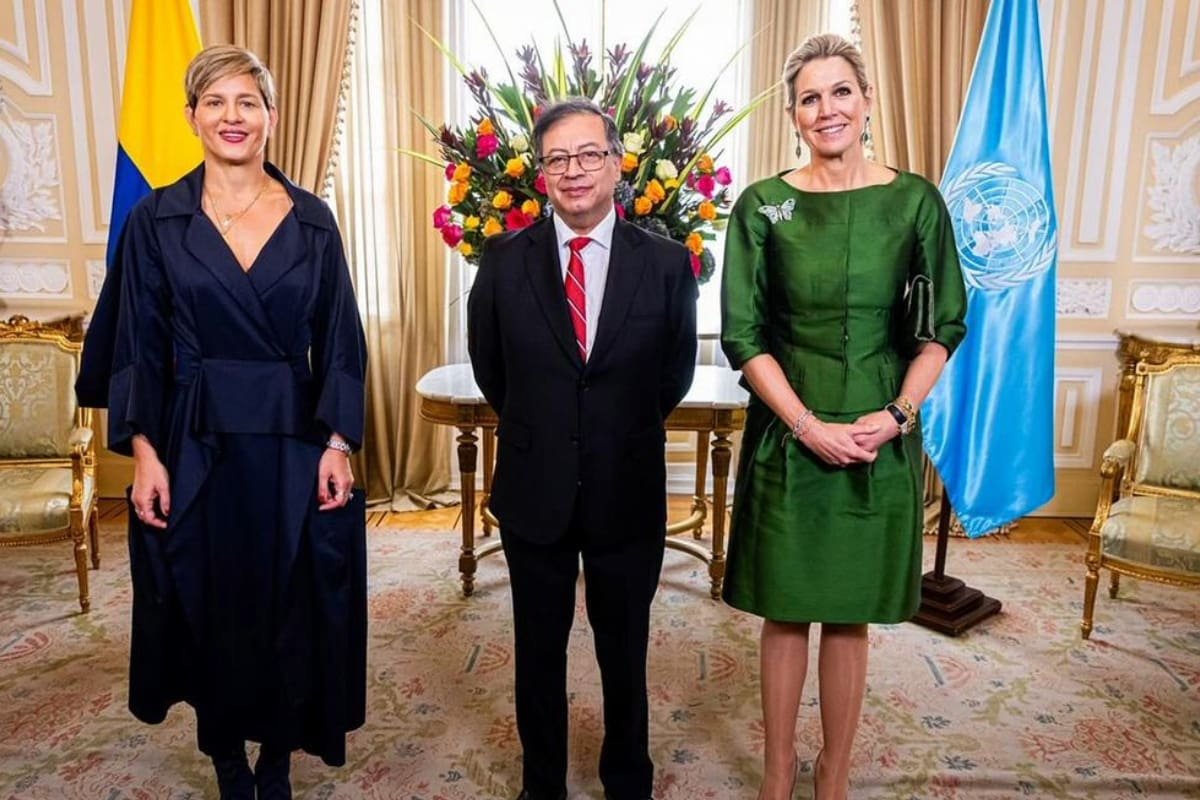 La reina de Países Bajos, asesora especial del secretario general de Naciones Unidas sobre Inclusión Financiera para el Desarrollo (UNSGSA), fue recibida en la Casa de Nariño, sede presidencial, por Verónica Alcocer, esposa de Petro, quien estuvo presente en la reunión que mantuvo la delegación de la ONU que acompaña a la monarca y la del Gobierno.