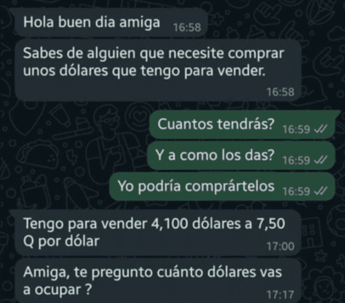 Al responder que no era ella quien intentaba acceder, perdió el control de su cuenta. Posteriormente, recibió una llamada de un número desconocido del extranjero, la cual no contestó pero devolvió. Al día siguiente, descubrió que su cuenta había sido hackeada y que los delincuentes estaban enviando mensajes a sus contactos haciéndose pasar por ella, ofreciendo dólares en venta.