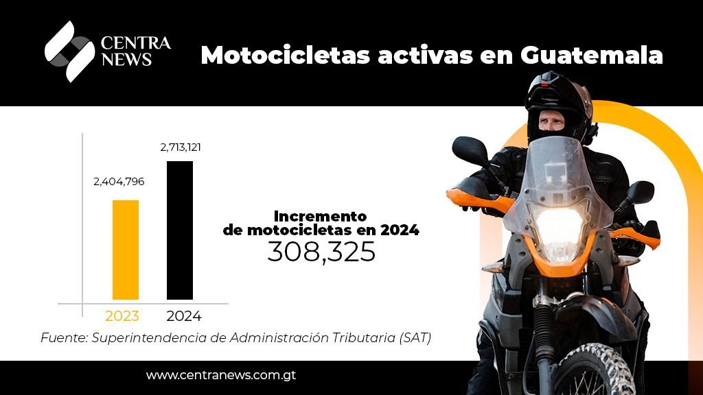 El incremento en el parque vehicular de dos ruedas crece en grandes proporciones cada año en Guatemala, principalmente en la capital. Según el Registro Fiscal de Vehículos de la Superintendencia de Administración Tributaria (SAT), al 14 de octubre de 2024 se contabilizan 2 millones 713 mil 121 motocicletas activas, mientras que, en 2023 se registraban 2 millones 404 mil 796, es decir que, en un año salieron a las calles 308 mil 325 motos más.