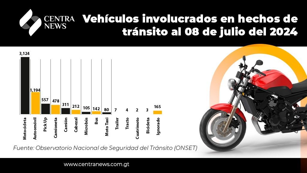 El Ministerio de Salud Pública y Asistencia Social (MSPAS), concuerda con sus estadísticas. Al mes de julio del presente año los accidentes de tránsito que involucran motocicletas, puntean con 3,124 seguidos de hechos con automóviles con 1 mil 194.