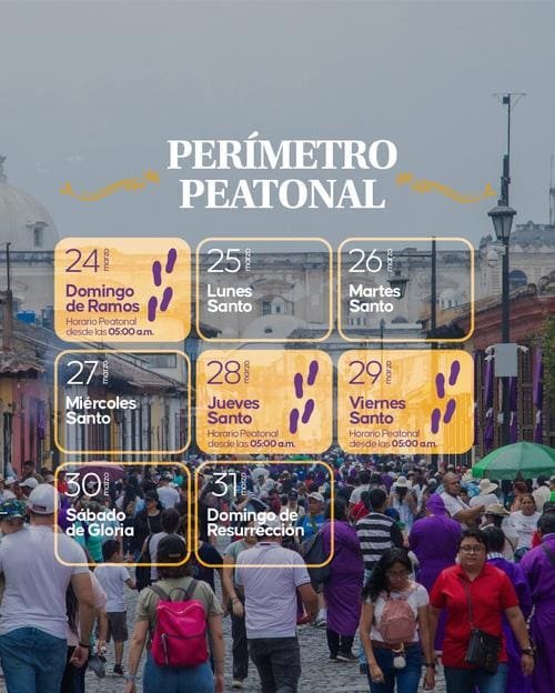Aunque no se prohíbe la entrada de vehículos a la ciudad, estos deberán respetar las indicaciones de las autoridades y desplazarse únicamente por los perímetros demarcados. Se prevé que jueves 28 y viernes 29 de marzo sean los días de mayor afluencia de visitantes en Antigua Guatemala, por lo que se insta a planificar con antelación el desplazamiento y tomar en consideración estas medidas de movilidad para evitar inconvenientes en el tránsito.