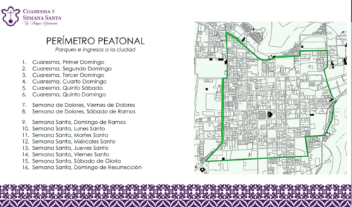 Durante este período, se ha dispuesto que la circulación vehicular esté restringida en el centro histórico, permitiendo únicamente el tránsito peatonal. Para aquellos que planean visitar la ciudad, se han habilitado diversos estacionamientos, incluyendo uno en la aldea Santa Inés y otros en el perímetro de la ciudad, para facilitar el acceso y evitar contratiempos.