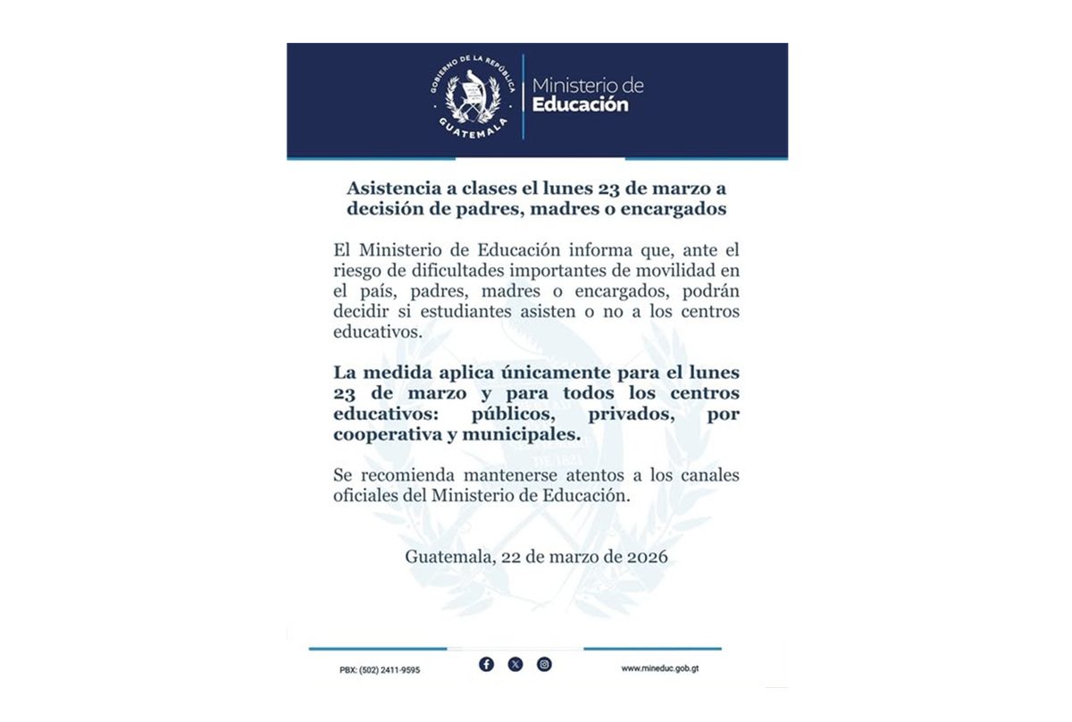El Ministerio de Educación de Guatemala informó que la asistencia a clases para el lunes 23 de marzo de 2026 quedará a decisión de padres, madres o encargados, debido al riesgo de dificultades importantes en la movilidad a nivel nacional.