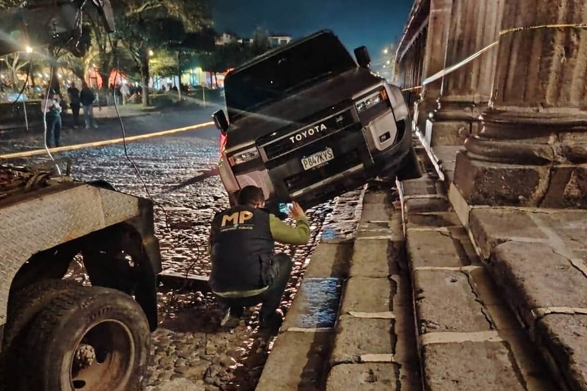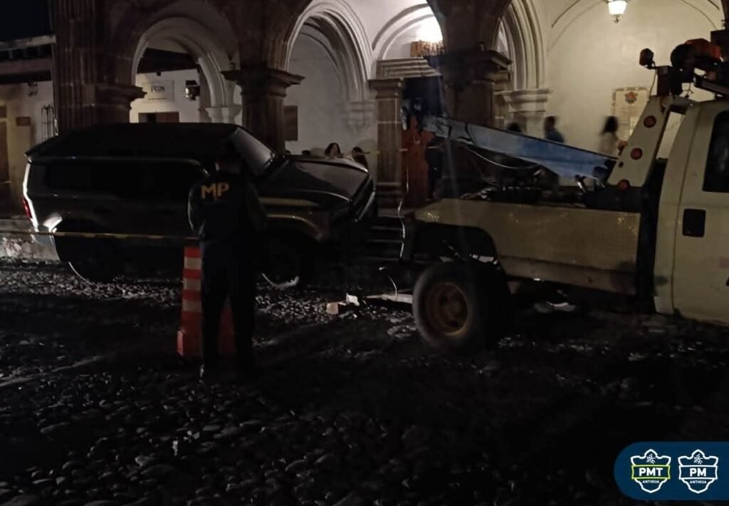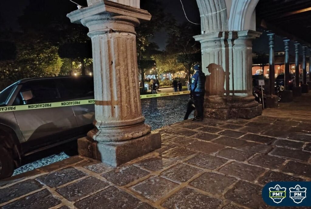Un vehículo impactó contra las gradas del edificio municipal de Antigua Guatemala; el conductor fue detenido y dos peatones resultaron con heridas leves.
