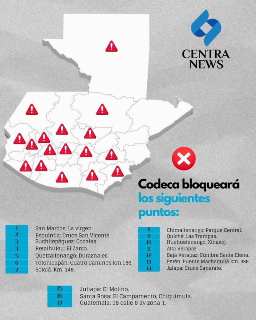 Codeca anuncia bloqueos en 20 puntos de Guatemala el 28 de abril en paro nacional para “exigir atención a sus demandas”. Estos serán los puntos afectados.