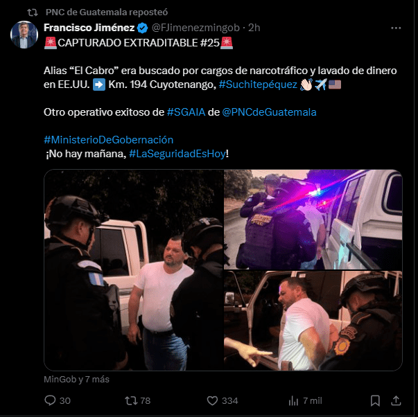 Con esta captura, suman ya 25 las personas detenidas en Guatemala con fines de extradición en lo que va del año, 17 de ellas por narcotráfico.