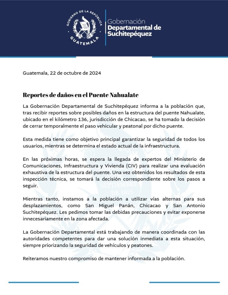 El tránsito por el puente Nahualate, ubicado en el kilómetro 137 de la CA-2 Occidente en Chicacao, Suchitepéquez, fue cerrado la noche del 22 de octubre debido a daños estructurales.