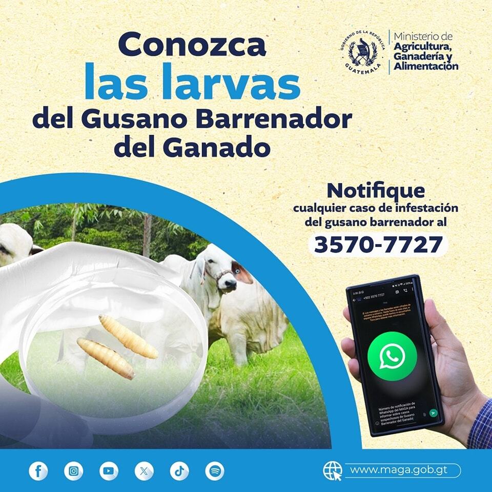 El primer caso de gusano barrenador, una larva de insecto que ataca tejido vivo en animales, fue detectado en una ternera, lo que motivó un refuerzo inmediato de las medidas de bioseguridad en las zonas afectadas. Además, el MAGA ha intensificado las inspecciones en las fincas ganaderas y continúa monitoreando los casos sospechosos.