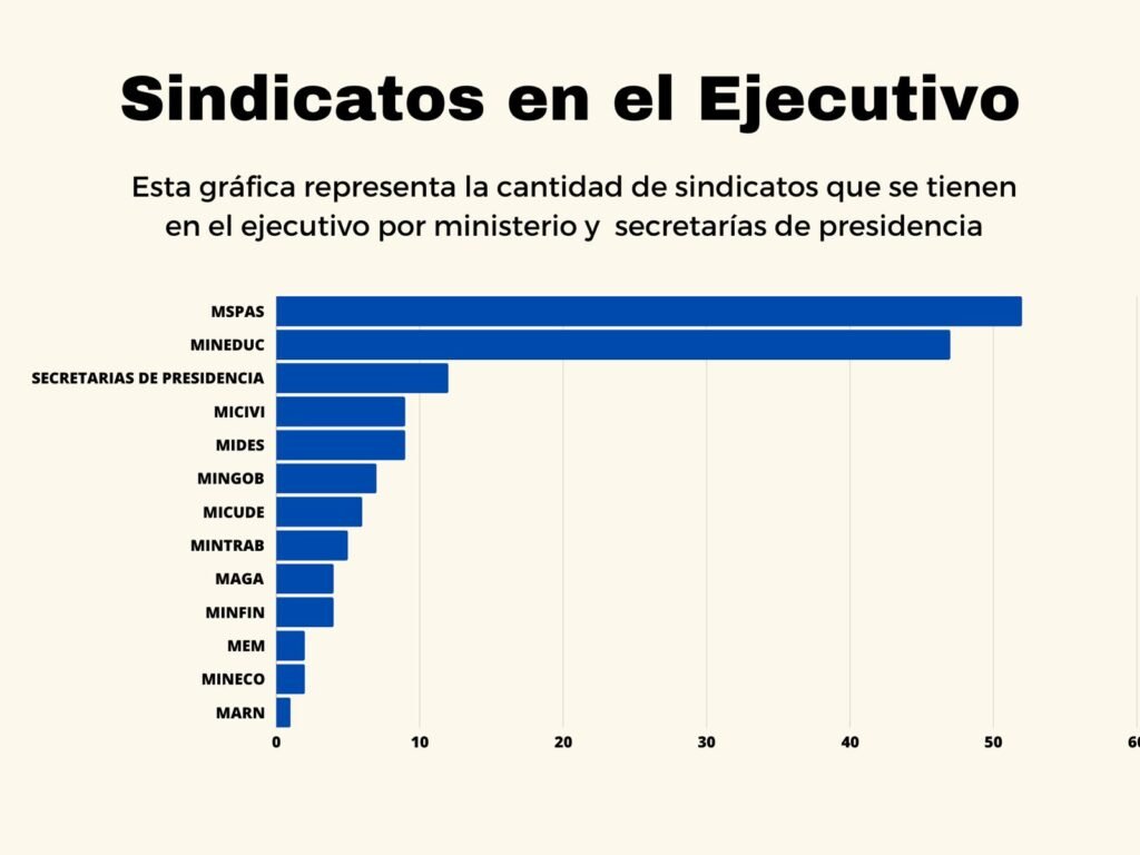 El número de organizaciones sindicales en el gobierno es considerable, con 618 en total, distribuidas principalmente en el Organismo Ejecutivo (160), el Legislativo (4) y el Judicial (3), así como en entidades municipales (369) y descentralizadas (82), incluyendo la más reciente en el Tribunal Supremo Electoral en 2022.