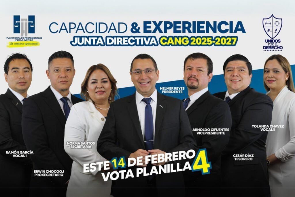Este viernes 14 de febrero, el gremio de abogados en Guatemala definirá el futuro del Colegio de Abogados y Notarios de Guatemala (CANG) en la segunda vuelta electoral. La contienda está marcada por dos planillas con diferentes propuestas y enfoques gremiales. Se enfrentan la Planilla 10 – Unidad X la Justicia, liderada por la abogada Patricia Elizabeth Gámez Barrera, y la Planilla 4 – Unidos por el Derecho – Plataforma de Profesionales por la Justicia, encabezada por Helmer Rolando Reyes García.