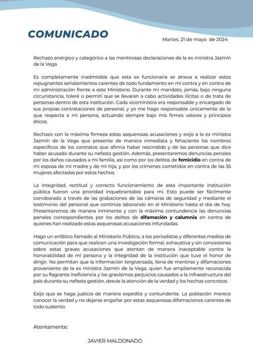 En respuesta a las recientes declaraciones de la exministra Jazmín de la Vega, Maldonado calificó las acusaciones como “completamente inadmisibles” y “carentes de todo fundamento”. En un comunicado difundido en redes sociales, afirmó: “Jamás, bajo ninguna circunstancia, toleré o permití actividades ilícitas o de trata de personas dentro de esta institución”.