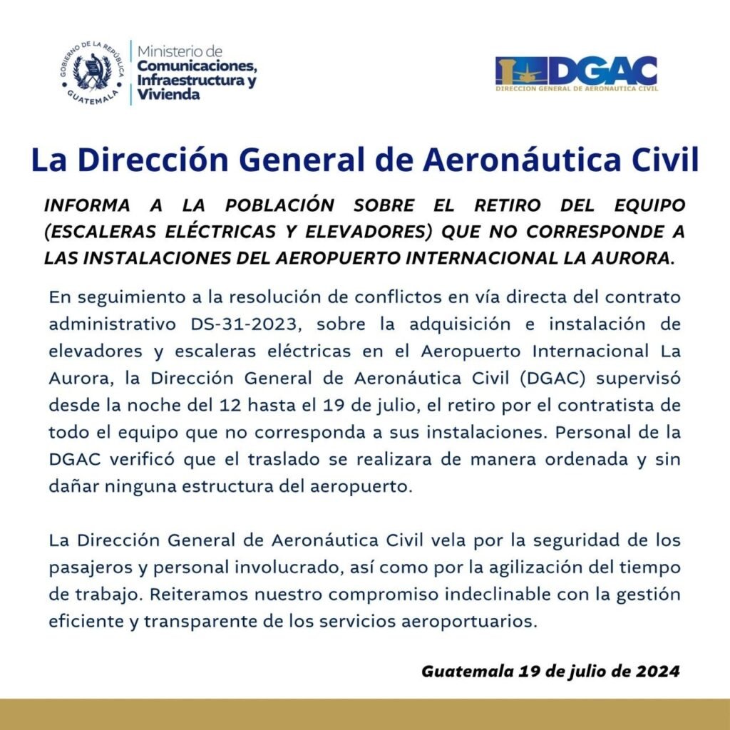 La Dirección General de Aeronáutica Civil (DGAC) anunció el viernes 19 de julio la finalización del retiro de escaleras eléctricas y ascensores que no correspondían a las especificaciones del Aeropuerto Internacional La Aurora en la zona 13 de la capital.