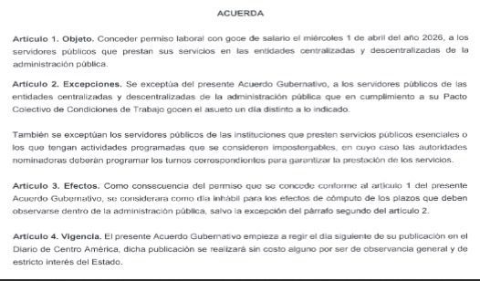 El Gobierno de Guatemala oficializó un asueto con goce de salario para los servidores públicos el miércoles 1 de abril de 2026, en el marco de la conmemoración de la Semana Santa.