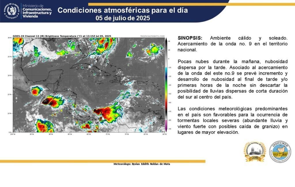 El Instituto Nacional de Sismología, Vulcanología, Meteorología e Hidrología (INSIVUMEH) alertó que el país se encuentra bajo los efectos de la temporada de lluvias, con el acercamiento de la onda del este número 9, lo que podría provocar un incremento de nubosidad y lluvias dispersas, especialmente en horas de la tarde y noche.