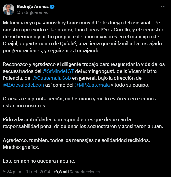 Enrique Arenas Echeverría y Ricardo Arenas Menes, empresarios agroindustriales retenidos en una finca de Chajul, Quiché, fueron liberados la noche del 31 de octubre tras un operativo coordinado entre el Ministerio de Gobernación y el Ministerio de la Defensa.