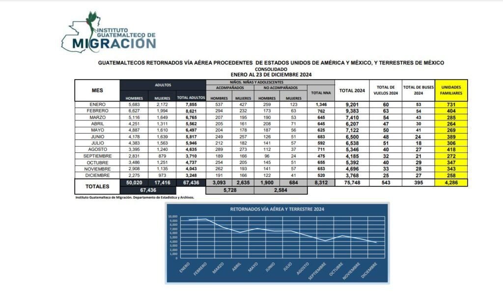 Guatemala registró un total de 75,748 personas retornadas desde Estados Unidos y México entre enero y el 23 de diciembre de 2024, según informó el Instituto Guatemalteco de Migración (IGM). Esta cifra representa una reducción en comparación con el mismo periodo del año anterior, cuando se reportaron 78,427 retornados.