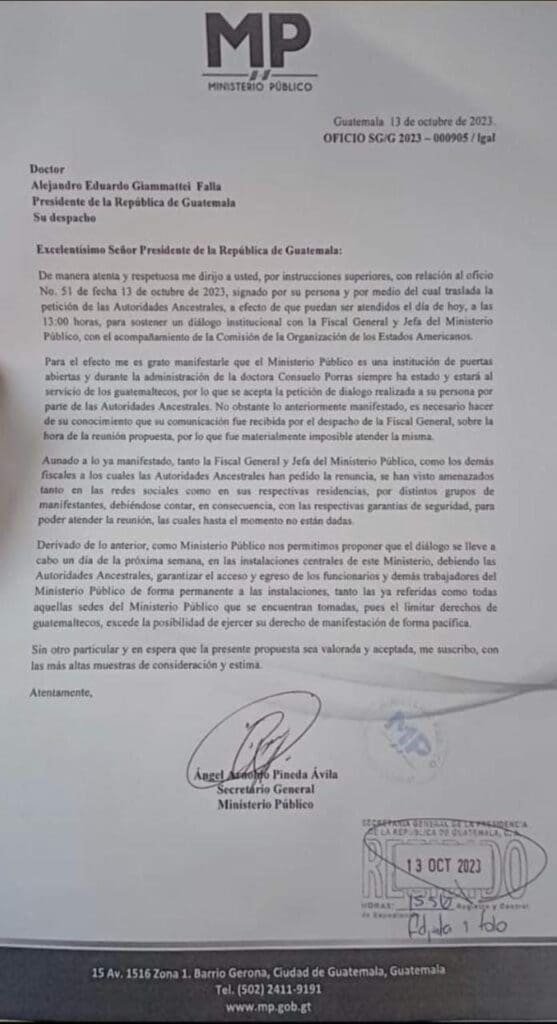 La respuesta a la solicitud presidencial fue dirigida al Presidente de la República de Guatemala, Alejandro Eduardo Giamennttel Falla, con relación al oficio No.1 de fecha 13 de octubre de 2023, sobre la petición de las Autoridades Ancestrales, a efecto de que pecden ser atendidos el día de hoy viernes 13 de octubre del presente año, con la finalidad de sostener un diálogo institucional con la Fiscal General y Jefa del Ministerio Público, Consuelo Porras, con el acompañamiento de la Comisión de la Organización de los Estados Americanos, OEA.