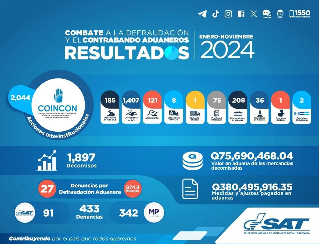 En 2024, las autoridades reportaron la incautación de mercaderías valoradas en más de 75 millones de quetzales, derivadas de más de 2,000 acciones de control aduanero.