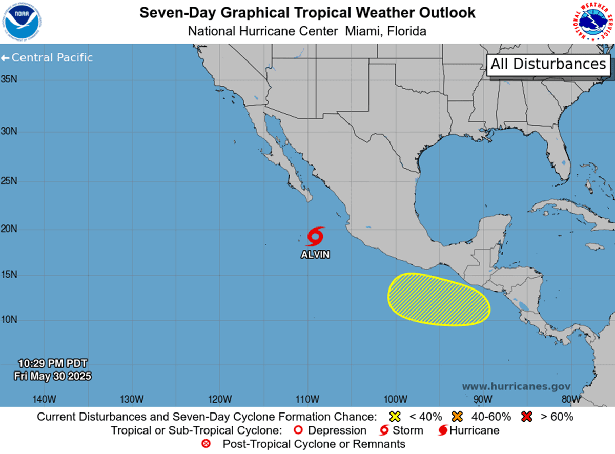 La temporada de huracanes en el Pacífico oriental ya presenta actividad significativa con la presencia de la tormenta tropical Alvin, ubicada a pocos cientos de millas al sur de la punta de la península de Baja California.