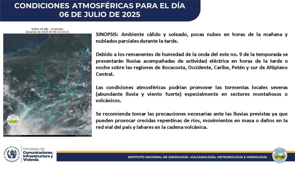 De acuerdo con el pronóstico emitido por INSIVUMEH, las lluvias estarán asociadas a los remanentes de humedad de la onda del este No. 9, lo que podría generar tormentas locales severas con abundante lluvia y fuertes vientos, principalmente en zonas montañosas y volcánicas.