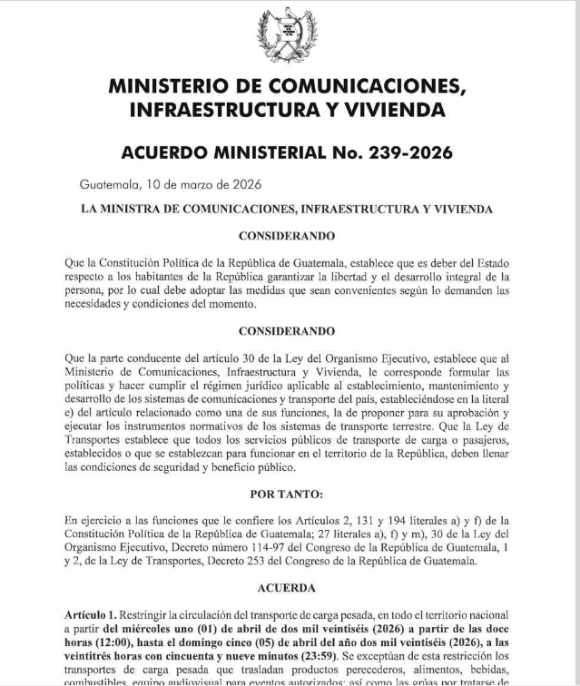 La disposición fue publicada en el Acuerdo Ministerial 239-2026, difundido en el Diario Oficial, donde se establecen los horarios y condiciones para la circulación de este tipo de vehículos en la red vial nacional.