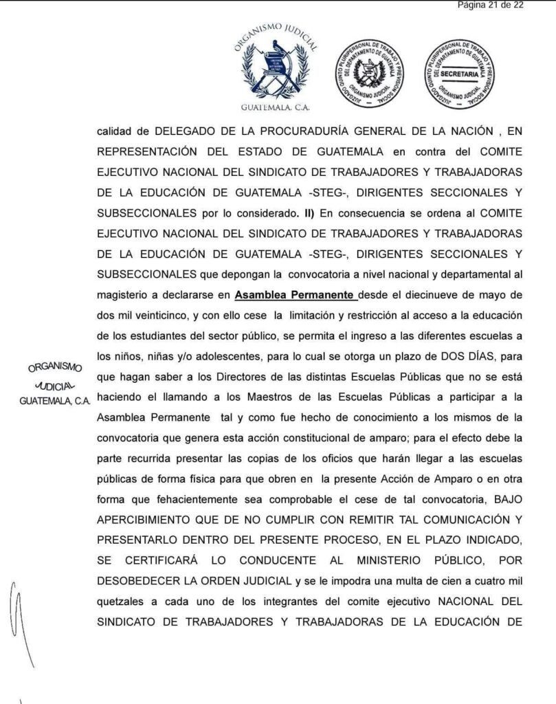 El Juzgado Quinto de Trabajo y Previsión Social resolvió el martes que el Sindicato de Trabajadoras y Trabajadores de la Educación de Guatemala (STEG) debe cesar de inmediato la suspensión de clases en todo el país, y ordenó la reanudación del servicio educativo en un plazo no mayor de 48 horas.