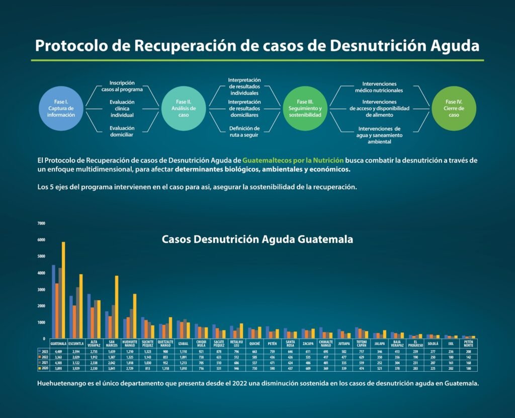 Entre 2020 y 2023, la tasa de desnutrición aguda en los municipios seleccionados aumentó en un 42%, de 50 a 120 casos por cada 10,000 niños. La tasa de recuperación en estas áreas es del 62%, inferior al promedio nacional. El Departamento de Guatemala concentra el 17% de todos los casos de desnutrición aguda reportados en el país en los últimos ocho años, lo que subraya la urgencia de esta intervención.