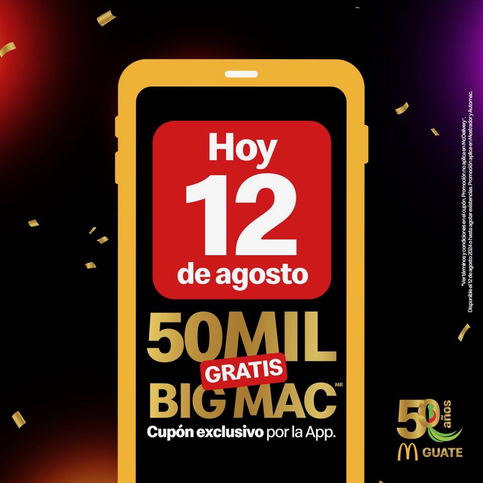 McDonald’s Guatemala celebrará su 50º aniversario con una promoción especial que distribuirá 50,000 Big Mac gratuitos el próximo 12 de agosto, a partir de las 3:00 p.m., hasta agotar existencias.
