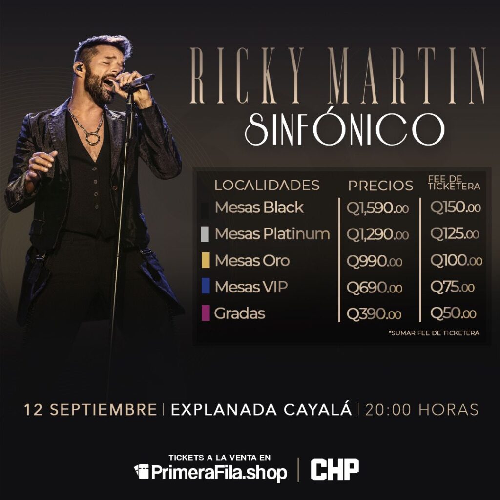 El famoso cantante puertorriqueño Ricky Martin regresará a Guatemala con su innovador espectáculo “Ricky Martin Sinfónico”, programado para el 12 de septiembre de 2024 en la Explanada Cayalá a las 20:00 horas.