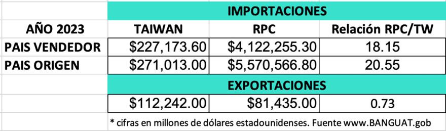 Analizando estas cifras tenemos que en el 2023 compramos 18.15 veces más productos a la RPC sobre TW como países vendedores y si el criterio es país de origen, esta relación aumenta a 20.55 al mismo tiempo exportamos 1.37 veces más a TW que a RPC. Estas cifras suceden sin que existan relaciones diplomáticas con la RPC frente a una relación comercial con TW que cuenta con un Tratado de Libre Comercio (2005).