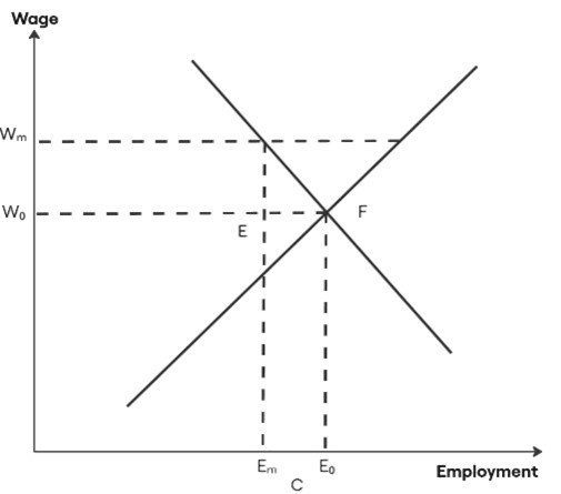Esto lo podemos ver reflejado en la gráfica 2, donde C es el sector cubierto por el salario mínimo. Cuando este aumenta de W_0 a W_m, el empleo se reduce a E_m con EF empleados sin trabajo en el sector cubierto (Hamermesh, 1993). Los empleados EF que ahora se quedaron sin empleo en el sector cubierto por el salario mínimo, tienden a buscar empleo en el sector no cubierto (informal), lo que lleva a tener una mayor empleabilidad pero con salarios más bajos (Welch, 1976).