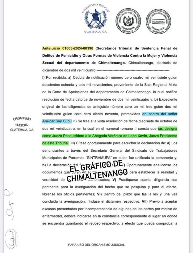 El Juzgado de Primera Instancia Penal, Narcoactividad y Delitos Contra el Ambiente de Chimaltenango dio trámite a una solicitud de antejuicio contra Amílcar Suy Cubul, alcalde de Parramos, y su concejo municipal. La querella, presentada el 20 de agosto de 2024, acusa al edil y a otros involucrados de delitos graves como plagio, secuestro e instigación a delinquir, en perjuicio de miembros del Sindicato de Trabajadores Municipales (SINTRAMUPA).