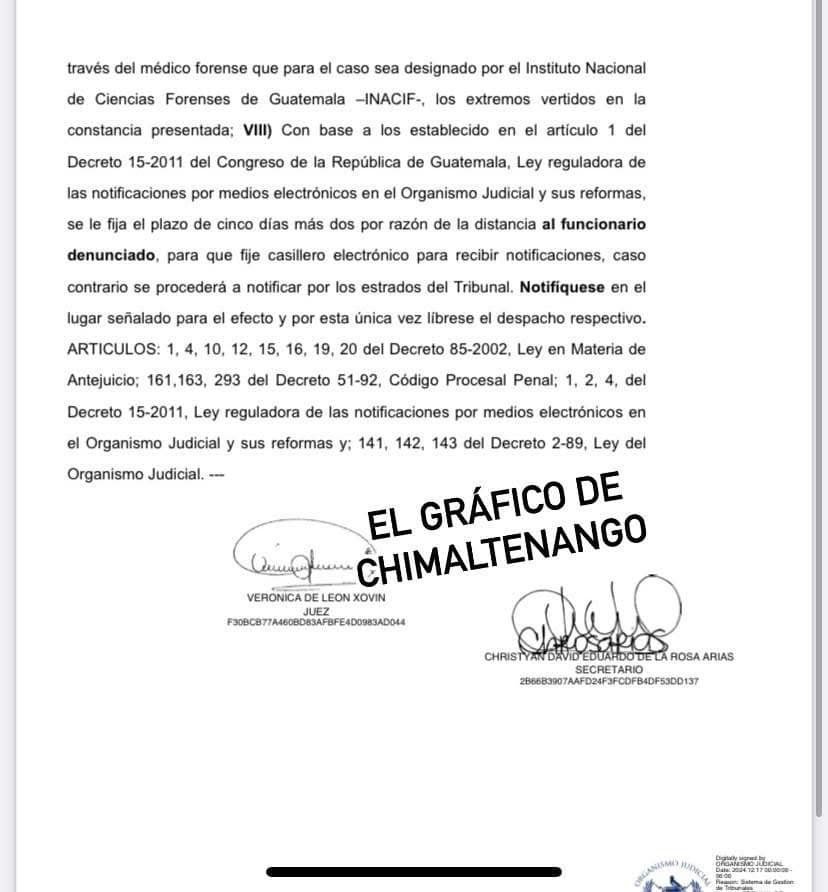 El 16 de diciembre de 2024, el Tribunal de Sentencia Penal de Delitos de Femicidio y Otras Formas de Violencia Contra la Mujer y Violencia Sexual de Chimaltenango designó a la abogada Verónica de León Xovín como jueza pesquisidora para investigar el proceso de antejuicio contra el alcalde, quien actualmente goza de inmunidad por su cargo.