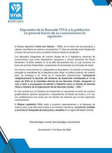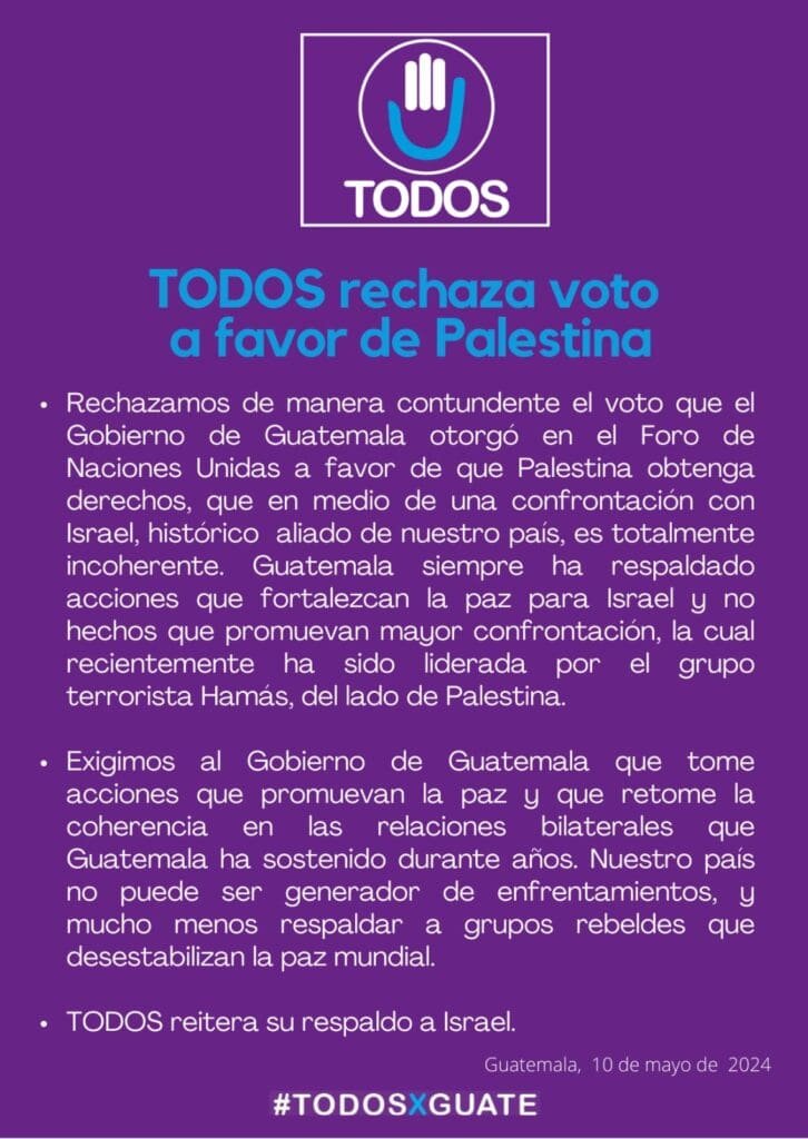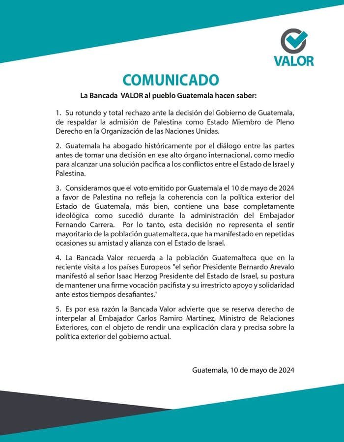 Varios bloques parlamentarios del Congreso de Guatemala han expresado su desaprobación hacia el reciente voto a favor de Palestina en la Asamblea General de las Naciones Unidas por parte del Gobierno.