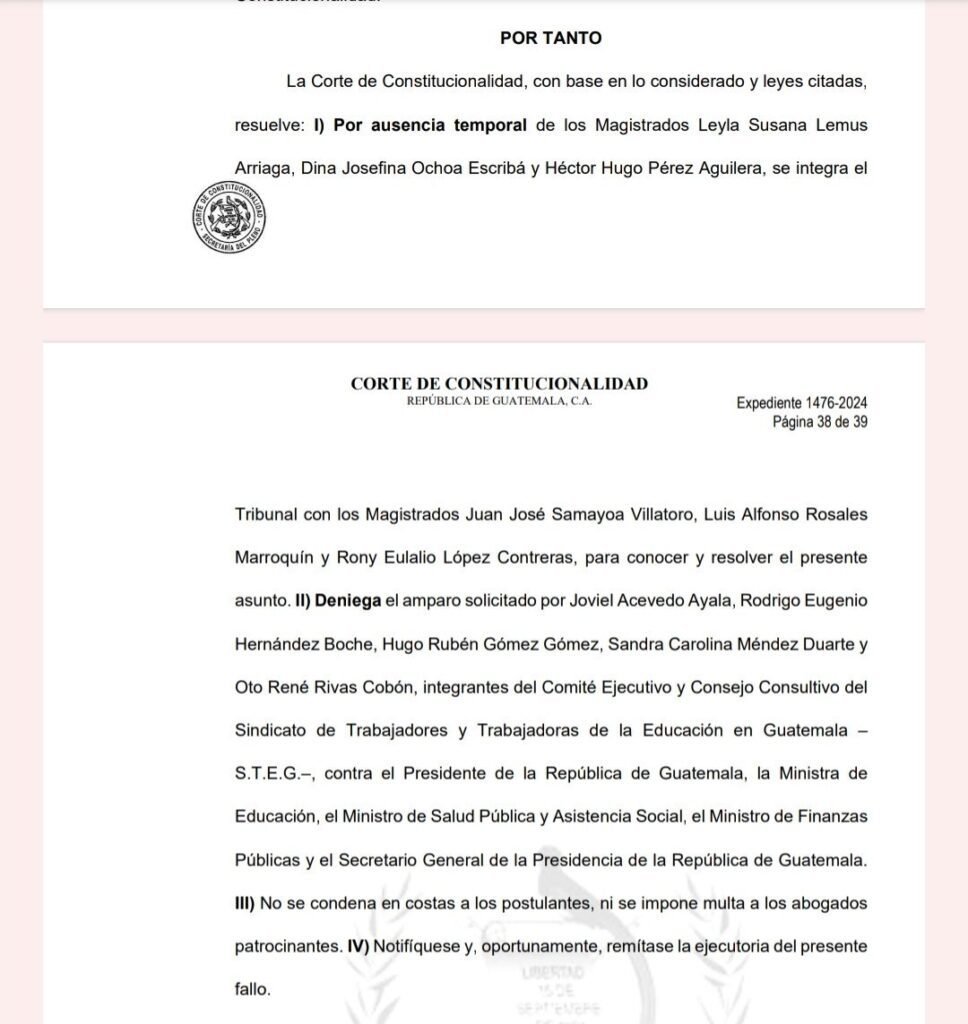 La Corte de Constitucionalidad (CC) de Guatemala resolvió rechazar de forma definitiva el amparo interpuesto por Joviel Acevedo, líder del Sindicato de Trabajadores de la Educación de Guatemala (STEG), con el cual buscaba reactivar el Programa del Seguro Médico Escolar.