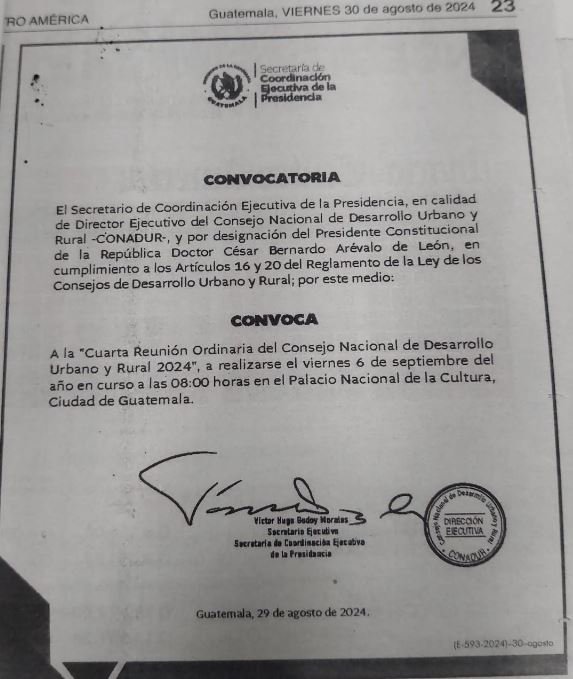 El Consejo Nacional de Desarrollo Urbano y Rural (Conadur) llevará a cabo su cuarta reunión ordinaria del año el próximo viernes 6 de septiembre a las 8:00 horas en el Palacio Nacional de la Cultura, según anunció la Secretaría de Coordinación Ejecutiva de la Presidencia (SCEP).