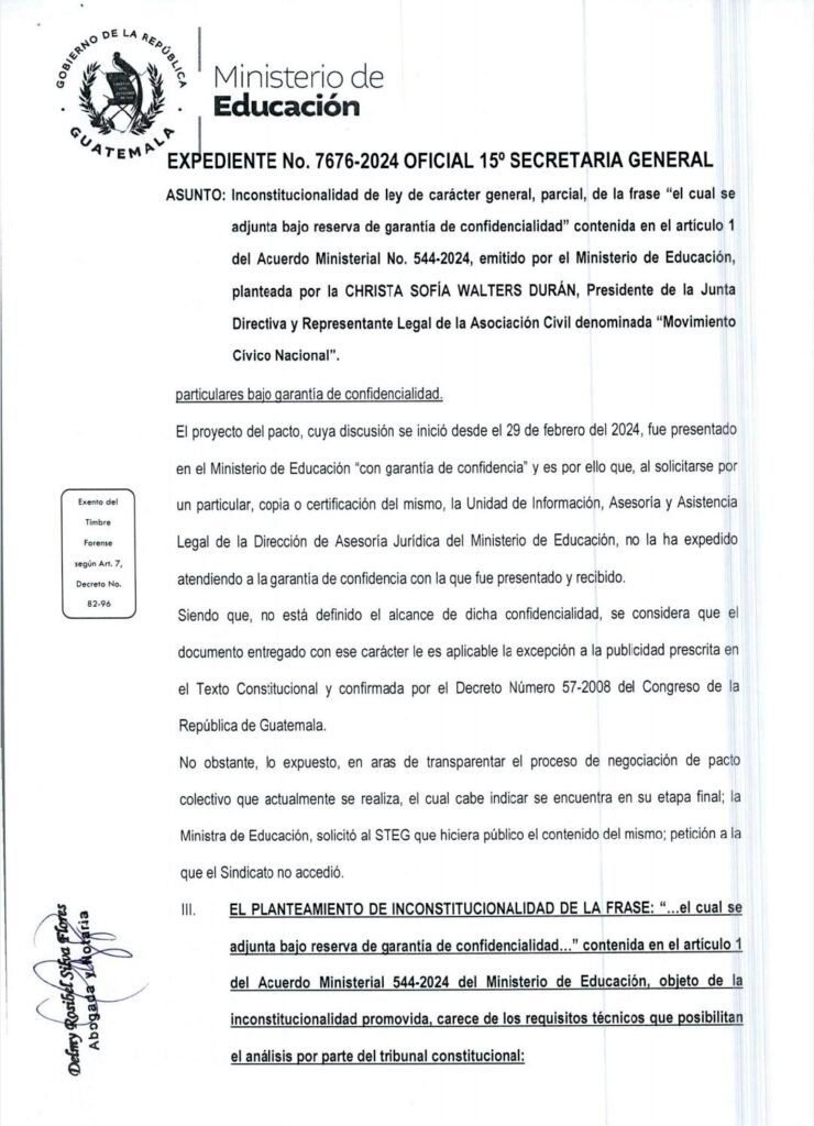 La Corte de Constitucionalidad (CC) de Guatemala desestimó una acción de inconstitucionalidad presentada por el Movimiento Cívico Nacional (MCN), con la que se buscaba eliminar la confidencialidad en las negociaciones del pacto colectivo entre el Ministerio de Educación (Mineduc) y el Sindicato de Trabajadores de la Educación de Guatemala (STEG), dirigido por Joviel Acevedo.