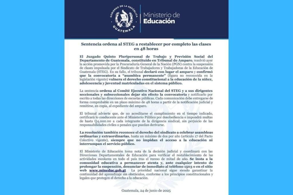 En un giro clave dentro de la prolongada protesta del Sindicato de Trabajadores de la Educación de Guatemala (STEG), el Juzgado Quinto Pluripersonal de Trabajo y Previsión Social resolvió con lugar el amparo interpuesto por la Procuraduría General de la Nación (PGN), y ordenó restablecer las clases públicas en un plazo máximo de 48 horas.
