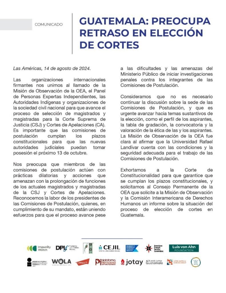 Diversas organizaciones internacionales, encabezadas por Impunity Watch, han expresado su preocupación ante el retraso en la elección de magistrados para la Corte Suprema de Justicia (CSJ) y las Cortes de Apelaciones en Guatemala.