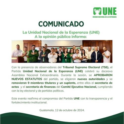 La Unidad Nacional de la Esperanza (UNE) llevó a cabo el sábado 12 de octubre una asamblea nacional en la que se confirmó a Sandra Torres como secretaria ejecutiva del partido.