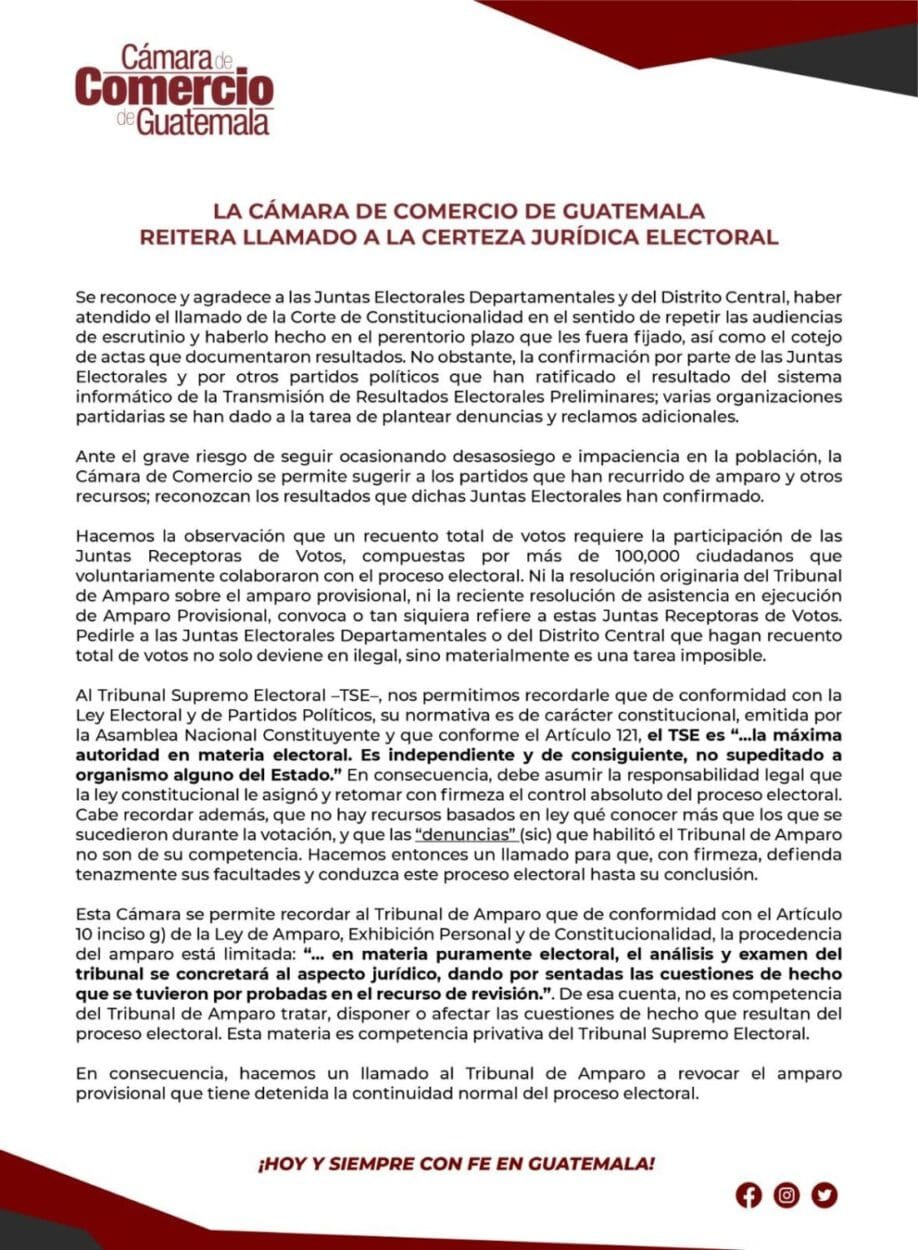 En el comunicado de prensa los integrantes de la Cámara de Comercio de Guatemala manifiestan que: Se reconoce y agradece a las Juntas Electorales Departamentales y del Distrito Central, haber atendido el llamado de la Corte de Constitucionalidad, CC, de repetir las audiencias de escrutinio y haberlo hecho en el plazo que les fue fijado, así como el cotejo de actas que documentan los resultados. No obstante, la confirmación por parte de las Juntas Electorales y por otros partidos políticos que han ratificado el resultado del sistema informático de la Transmisión de Resultados Electorales Preliminares; varias organizaciones partidarias se han dado a la tarea de plantear denuncias y reclamos adicionales.