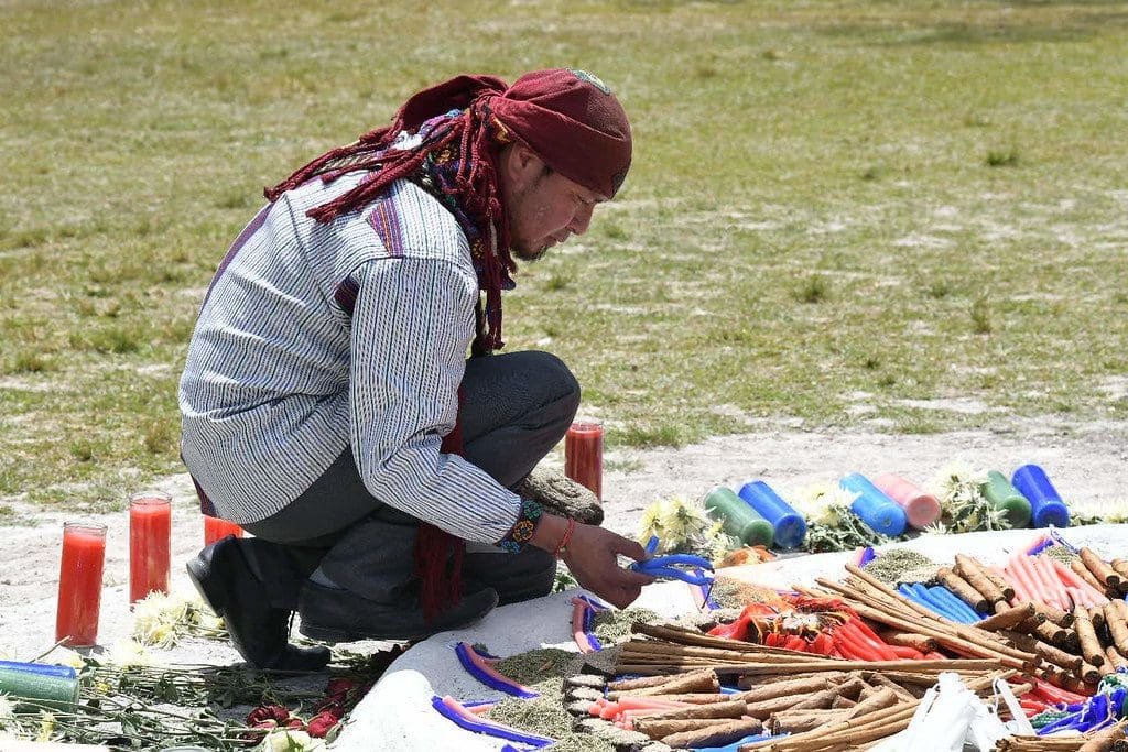 Durante la actividad, el contador del tiempo maya Nelson Tuyuc, llamado ajq’ijab, dirigió una ceremonia de invocación a las energías terrestres y cósmicas. Tal rito incluye los nombres de sitios ceremoniales, volcanes, ríos, montañas y otros lugares en específico. Asimismo, imploró a las 20 energías de la cosmovisión maya, comienzando con b’atz y termina con tz’i’.
