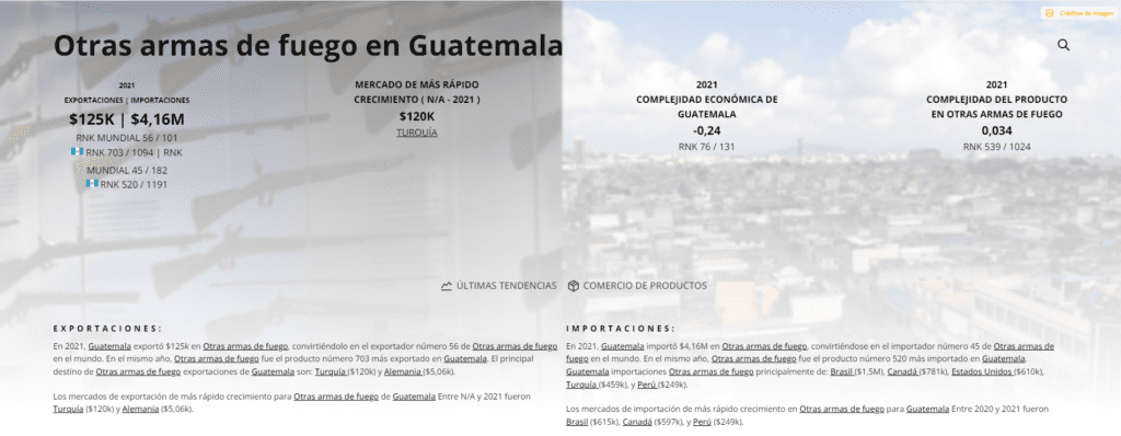 En 2021, Guatemala importó $4,16M, convirtiéndose en el importador número 45 de otras armas de fuego en el mundo. En el mismo año, y el producto número 520 más importado. Sus proveedores son: Brasil ($1,5M), Canadá ($781k), Estados Unidos ($610k), Turquía ($459k) y Perú ($249k).